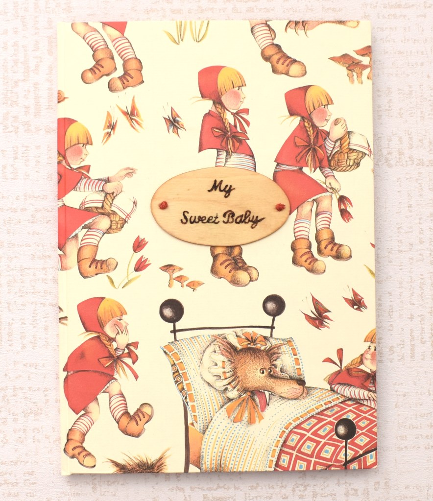 Art. 0282 – Libro del neonato in tema Cappuccetto Rosso, decorato con una pirografia in legno realizzata a mano. Disponibile in lingua italiana/francese/inglese.