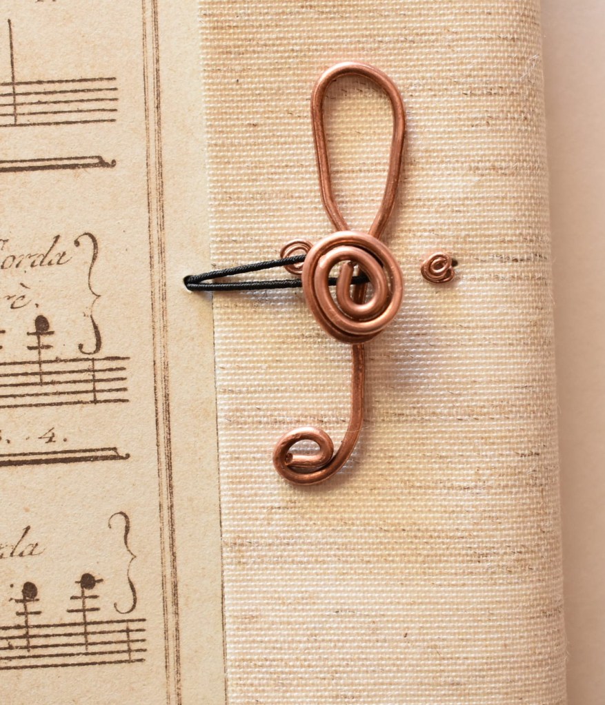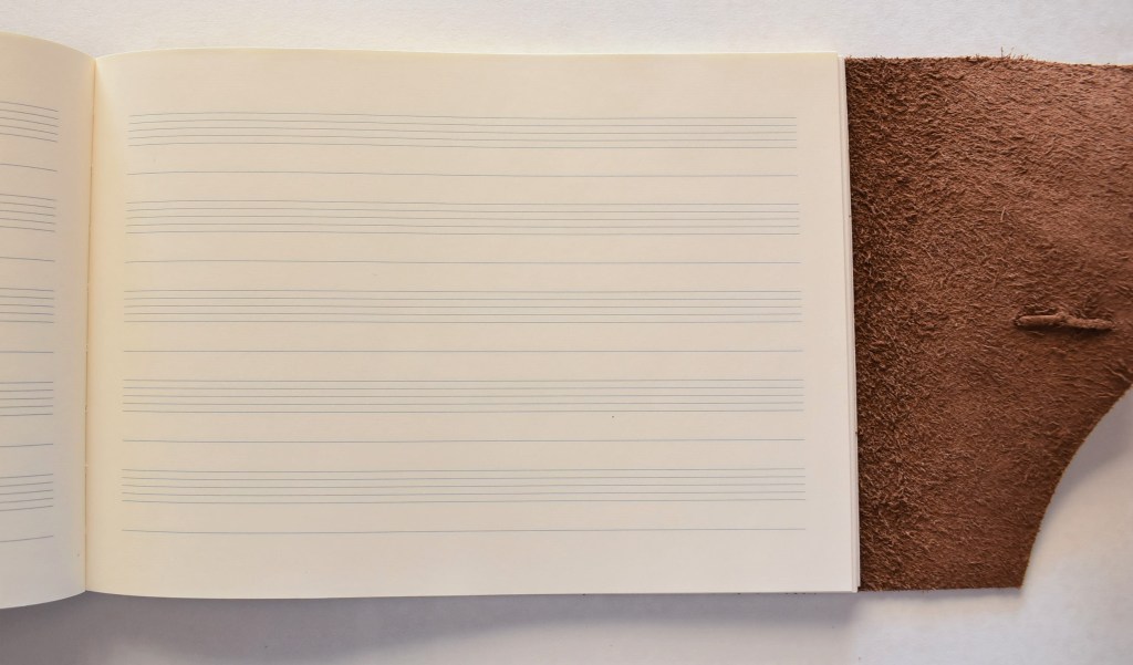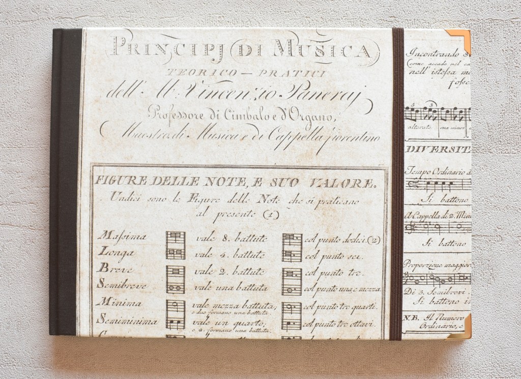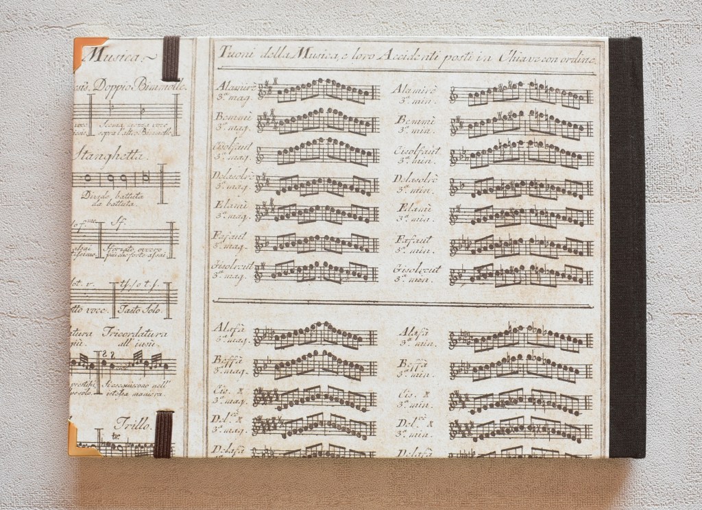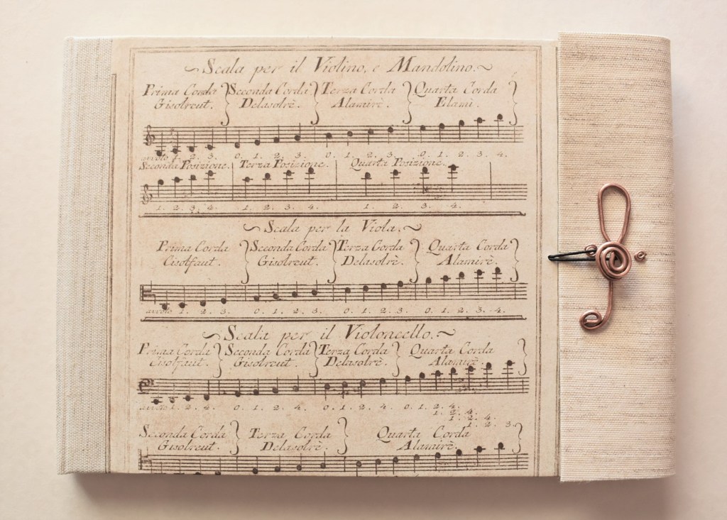 Art. 0175 – Pentagramma in copertina rigida, dorso e retro in tela, chiave di violino in rame e stampa.