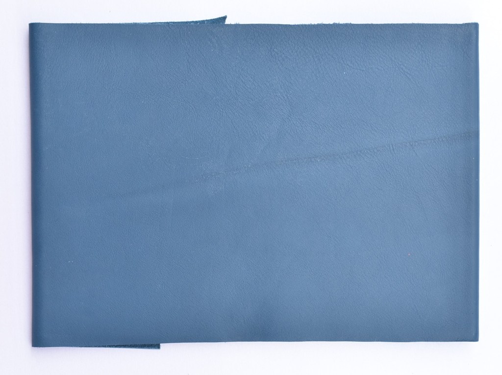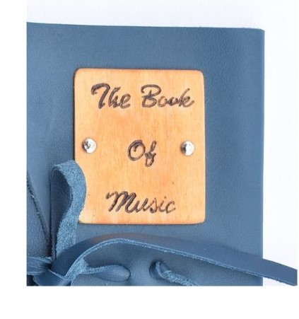 Art. 0177 – Pentagramma con copertina in pelle blu oceano, con risvolto e fiocco a chiusura. Decorato con targa in legno pirografata a mano