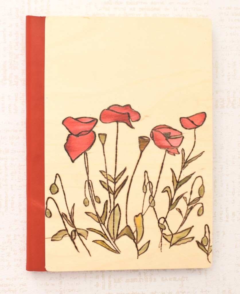 Art. 0301 – Diario con pannello in legno pirografato e dipinto a mano, fantasia papaveri e retro in pelle rossa. L’interno è strutturato come diario a righe e decorato con cornici romantiche.