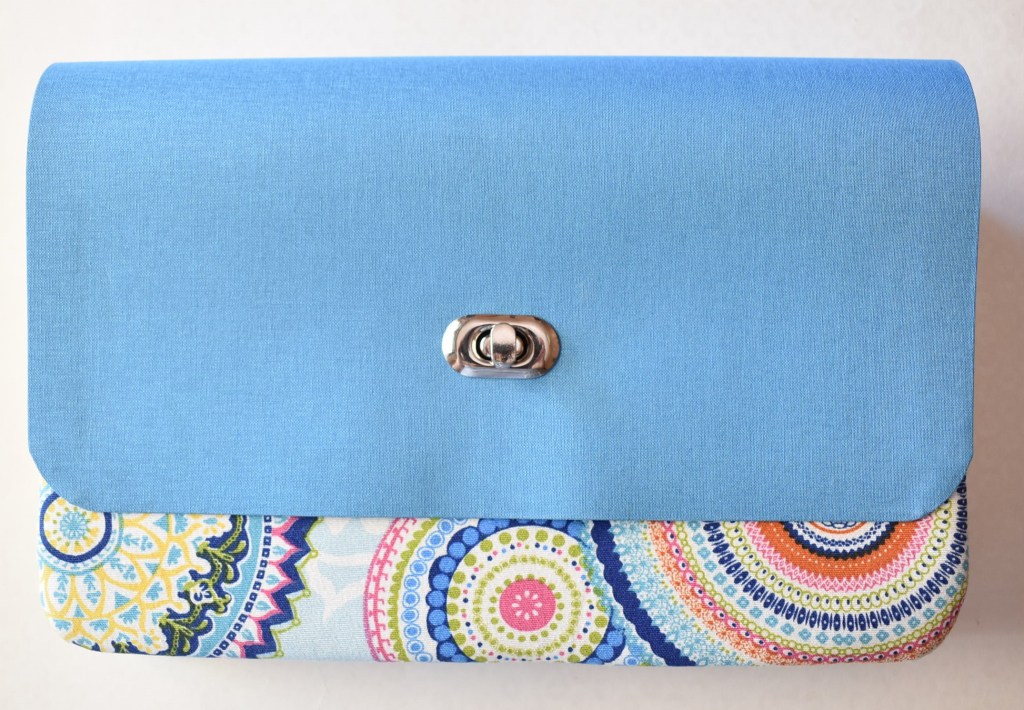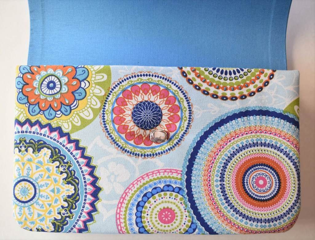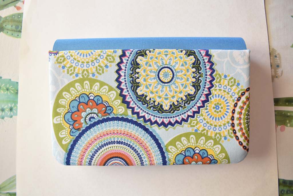 Art. 0301 – Porta documenti imbottito e rivestito in tessuto in stile Mandala, chiusura in metallo (dimensioni 18 x 29 cm).