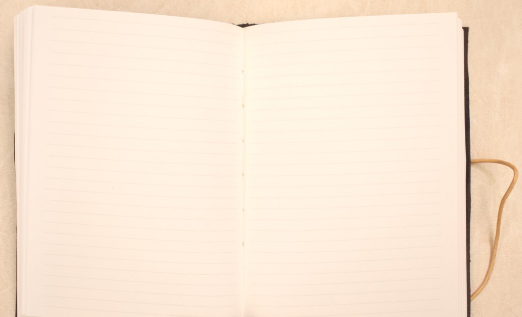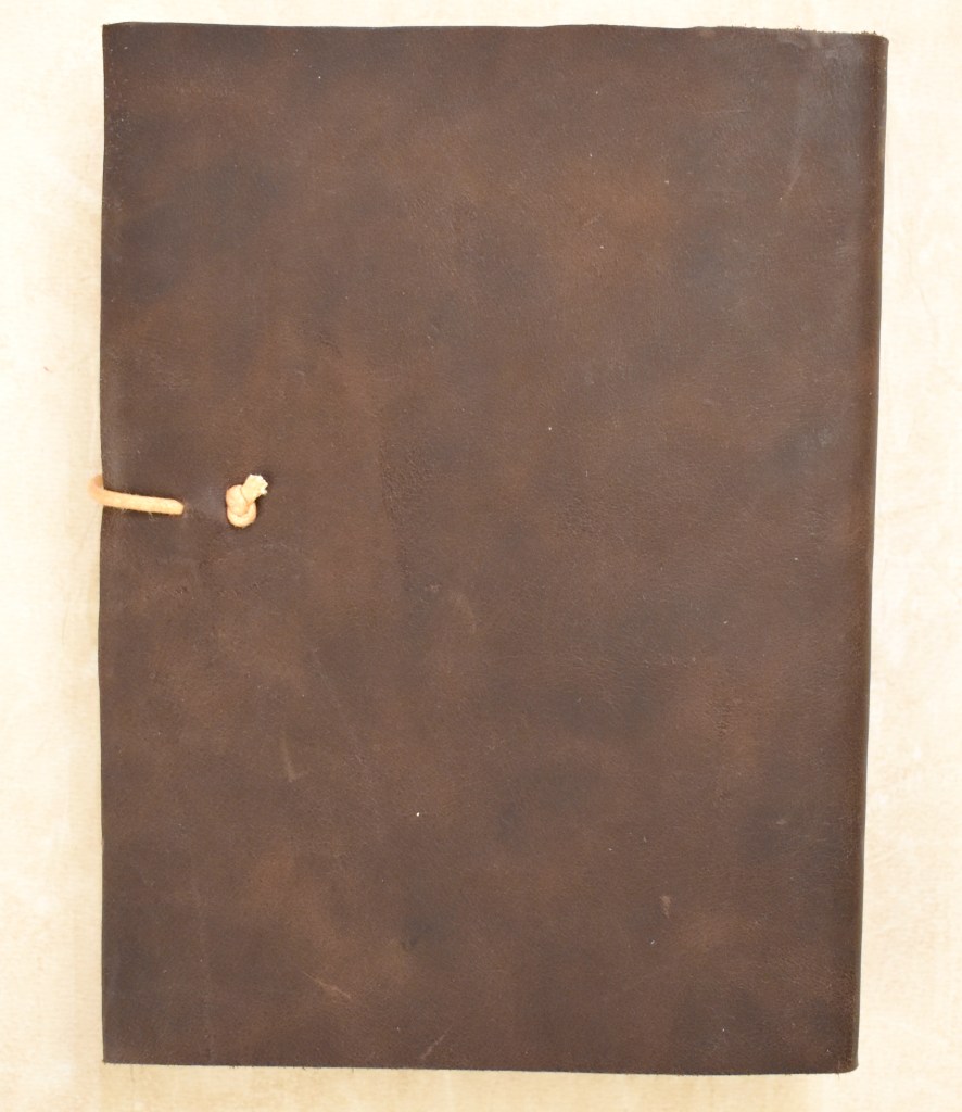 Art. 0115 – Quaderno in cuoio scuro, con spirale in rame e laccetto panna, interno a righe o bianco (a scelta)