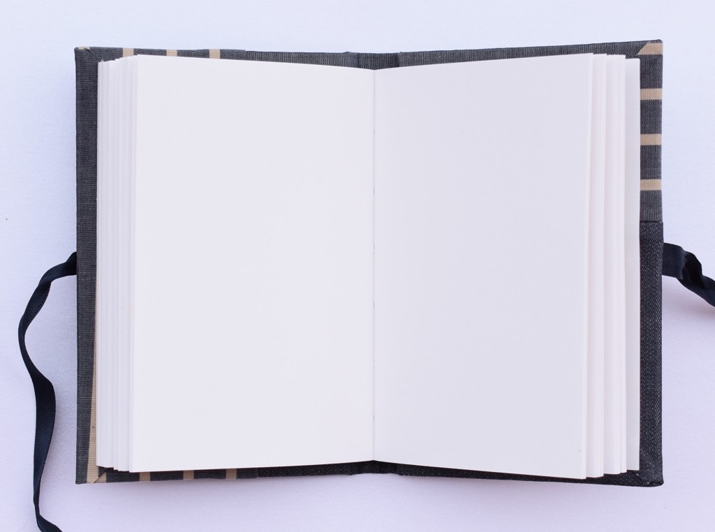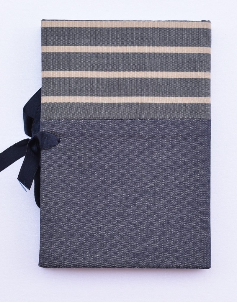 Art. 0211 – Quaderno “Righe Blu” in tessuto blu e tessuto a righe beige e blu, con laccetto raso blu scuro, interno bianco. Pezzo unico