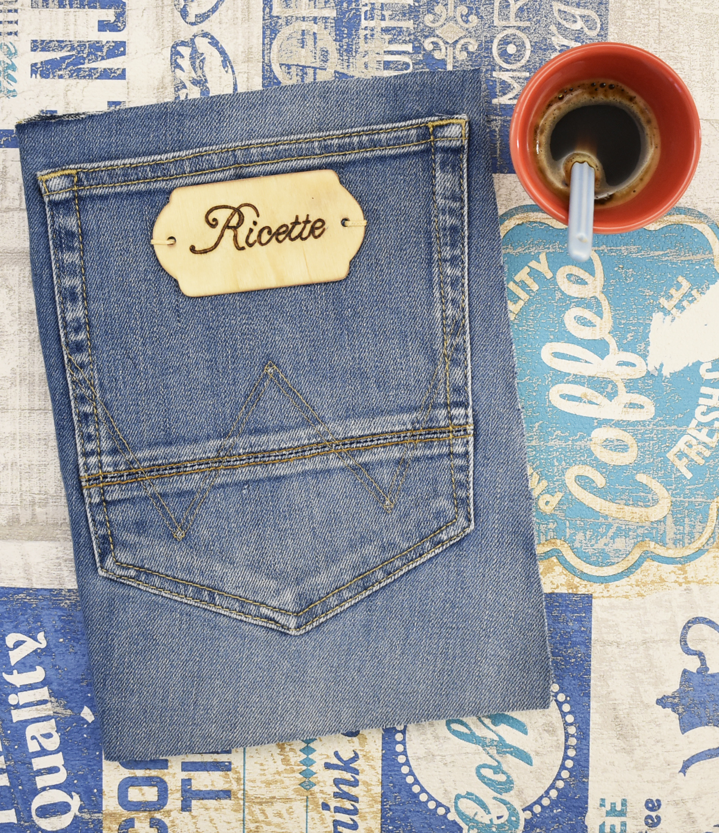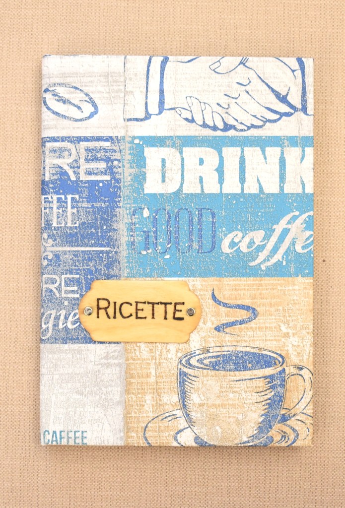 Ricettario in copertina rigida, rivestito in stampa in stile americano e targhetta in legno pirografata a mano (dimensioni 170 x 240 mm).