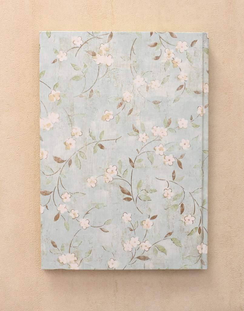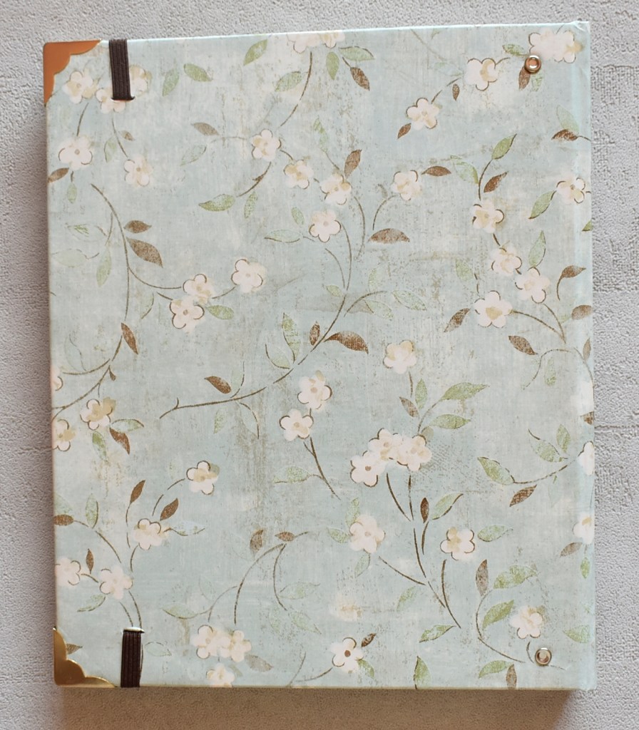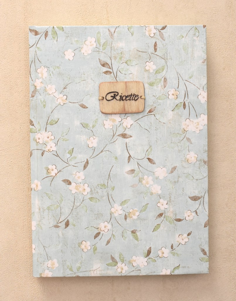 Ricettario realizzato con carta americana in stile floreale su sfondo azzurro (dimensioni 170 x 240 mm).