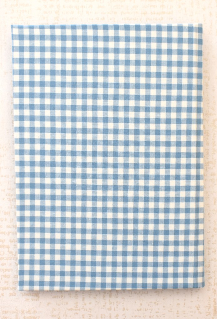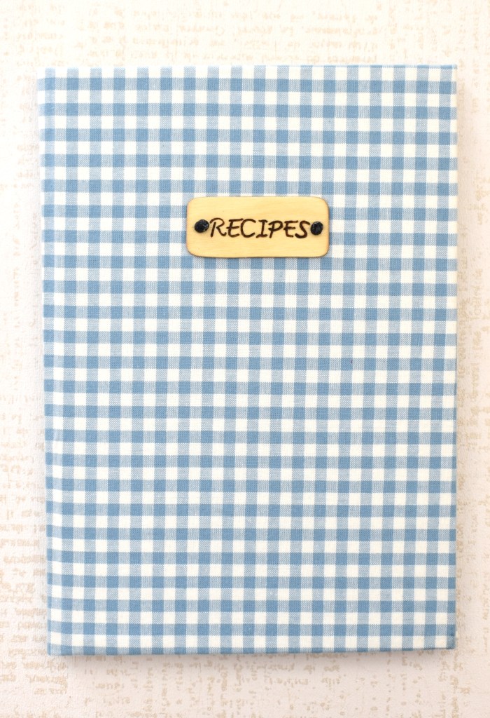Ricettario in copertina rigida, rivestito in tessuto a quadretti blu stile anni ’50 e targhetta in legno pirografata a mano (dimensioni 170 x 240 mm).