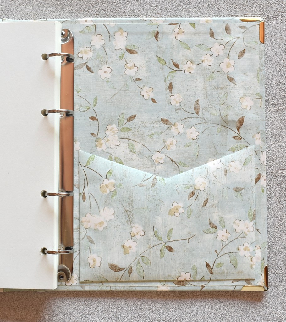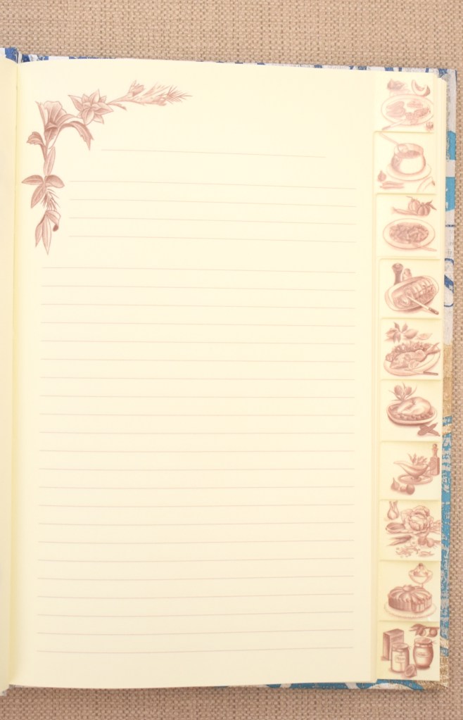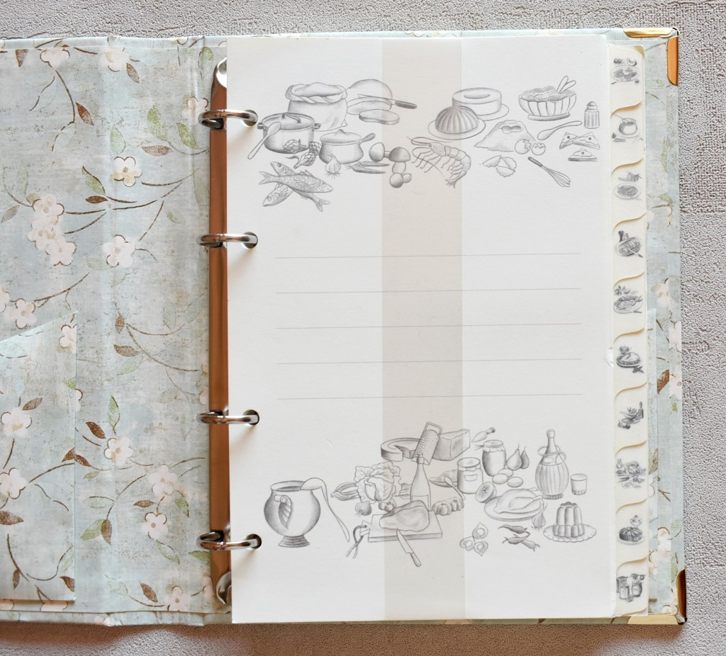 Ricettario realizzato con carta americana in stile floreale su sfondo azzurro nella versione meccanismo ad anelli (dimensioni 170 x 240 mm). Il ricettario è dotato di due tasche laterali per l’inserimento di appunti e fogli.