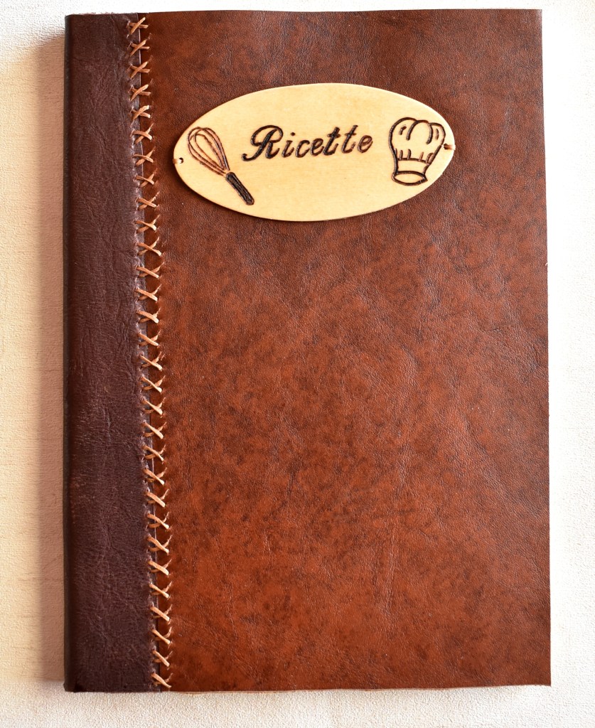 Ricettario con copertina in pelle cucita a mano, e targhetta in legno pirografata a mano (dimensioni ricettario 170 x 240 mm).